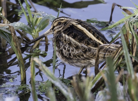 A jack snipe lurking in the vegetation at the edge of a pool, it's stripy camouflage helping it blend in with the grasses