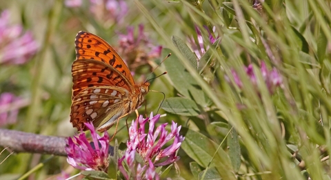 The high brown fritillary is a large orange butterfly with intricate black markings, similar to several other species of fritillary. High brown fritillaries are found in woodland clearings and grassy areas on moorland slopes, where there is a mosaic of dense bracken and grassy patches; or on outcrops of limestone rock where woodland or scrub has recently been cleared.