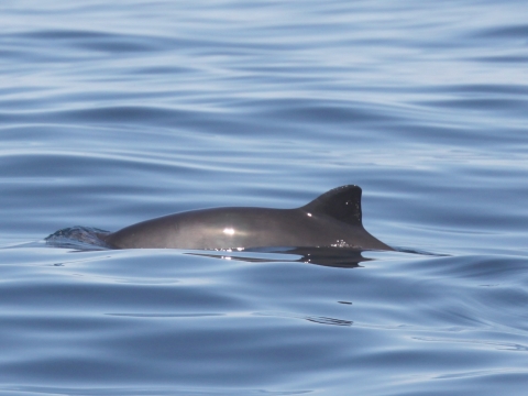 Look out for a small, triangular dorsal fin breaking the surface. Harbour porpoise are small and stocky, with a dark grey back and lighter underbelly. Their faces are rounded and have no beak.